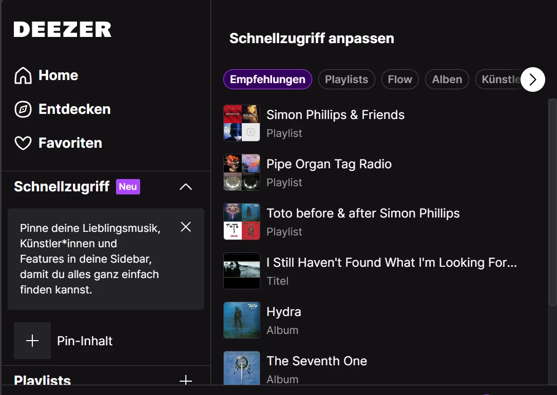 Du hast im Browser nun Links deine angepinnten Playlists/Songs/Alben