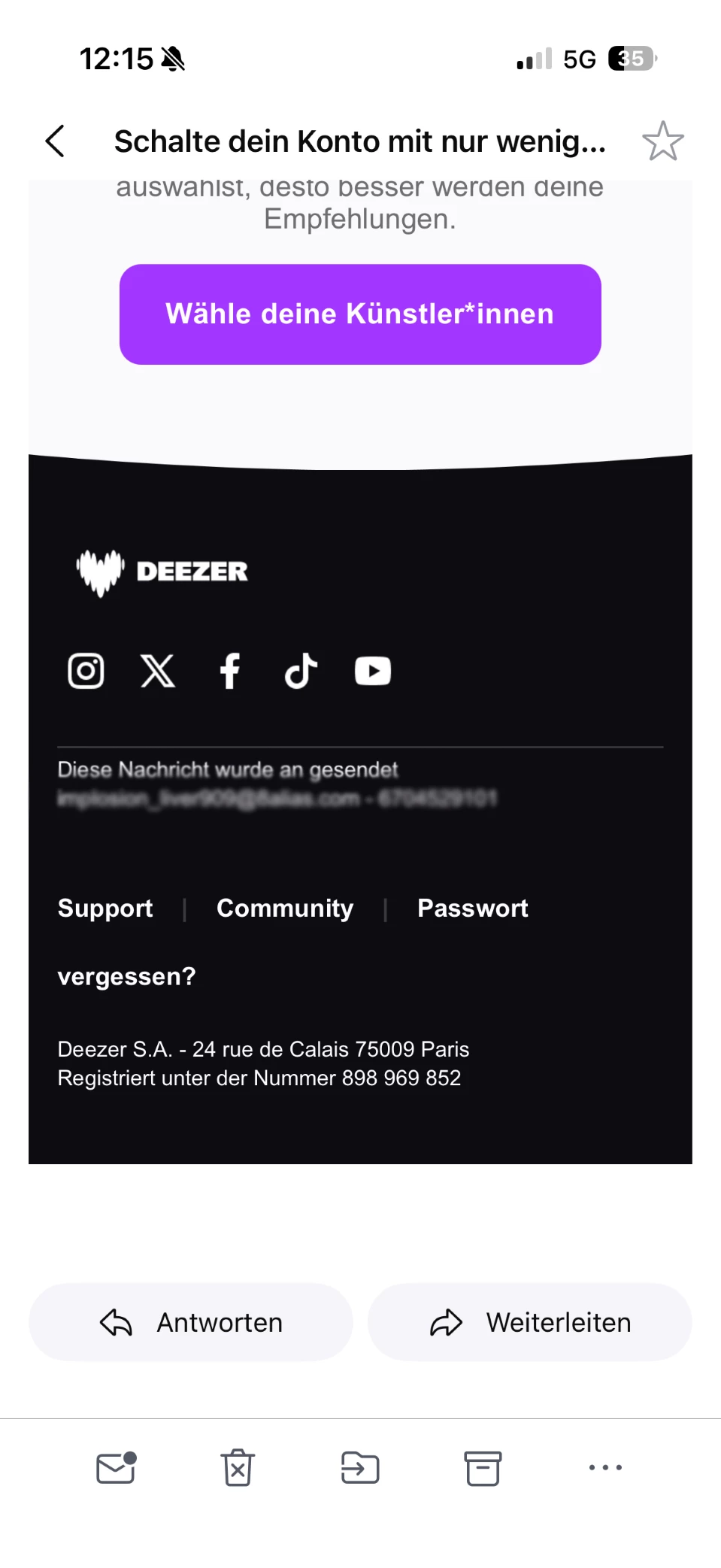 Obwohl in meiner Deezer iOS-App die Benachrichtigung per Email abgewählt ist, bekomme ich jeden Tag mehrere Emails von Deezer. Heute u.a. eine Email mit dem Titel “Schalte dein Konto mit nur wenigen Klicks frei”. Der Inhalt der Email ist, dass ich meine Lieblingskünstler auswählen soll. Das habe ich aber bereits getan nachdem ich meinen Account erstellt habe. Die ausgewählten Künstler sind auch in Deezer gespeichert und zu sehen.