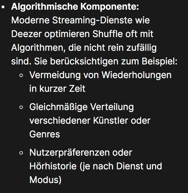 Hi ​@johannious, darf ich fragen, aus welcher Quelle die Inhalte des gezeigten Bildes stammen? Ich gehe davon aus, dass die Shuffle-Funktion (Zufallswiedergabe) bei keinem Streamingdienst vollständig zufallsbasiert ist. Aus wirtschaftlicher Perspektive wäre ein strikt zufälliger Algorithmus ohnehin wenig sinnvoll — doch das würde an dieser Stelle zu weit führen. Grundsätzlich legen weder Deezer noch andere Anbieter ihre genauen Empfehlungs- und Auswahlalgorithmen offen. Wäre mir zumindest nur in begrenzten Rahmen bekannt… Daher würde ich, ohne die zugrunde liegende Quelle zu kennen, die im Bild getroffenen Aussagen mit entsprechender Vorsicht betrachten🤷‍♂️