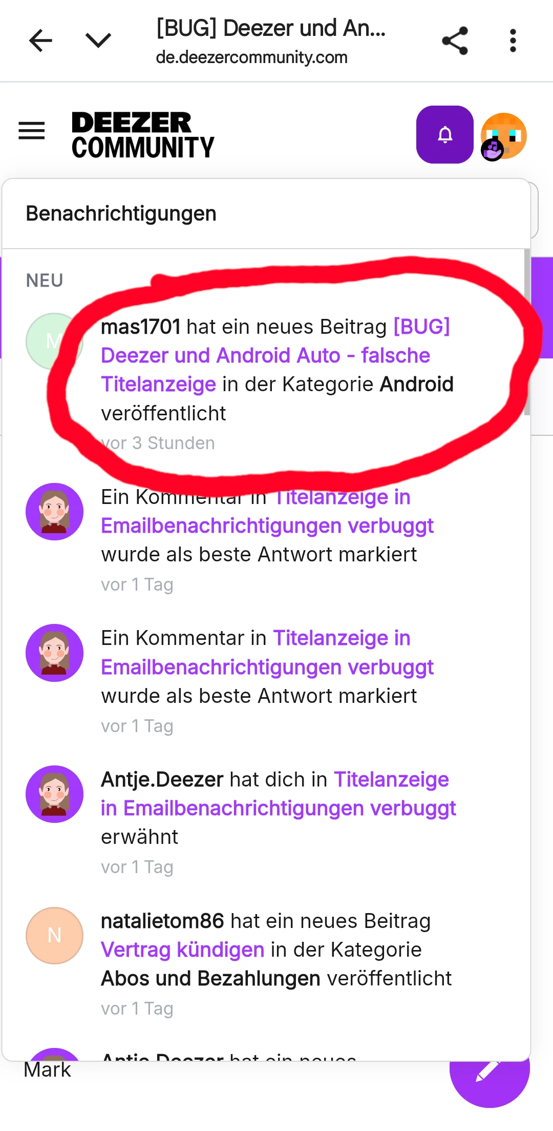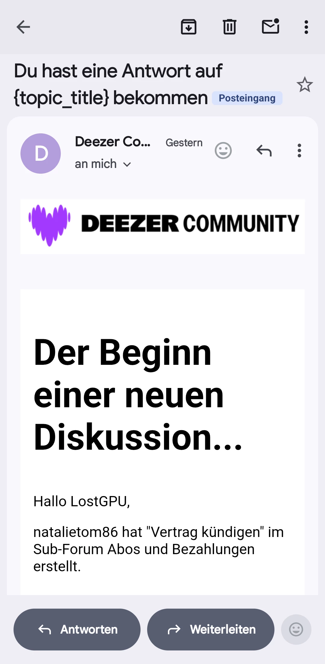 Hey, immer wenn ich eine neue Benachrichtigung für ein Thema in der Deezer Community bekomme, dann steht im Betreff statt dem Namen des Themas {topic_title} (Bild unten). Ich tippe mal auf einen Programmierfehler.