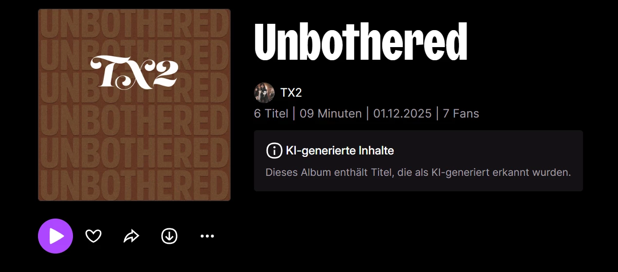 Sofern Deezer die Alben und Singles als KI-generiert kennzeichnet, sollten sie auch nicht in Deinen Empfehlungen oder in Deezer-Playlisten auftauchen. Hier ein Beispiel für ein neues Album von TX2, es sind allerdings nicht alle Alben/EPs oder Singles so gekennzeichnet:
