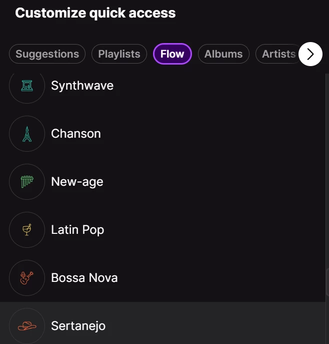 Neuerdings kann man ja im Webplayer die Flow-Genres und Moods auswählen und links anpinnen, da sind ziemlich viele dabei, u.a. Synthwave. Meinst Du das vielleicht?