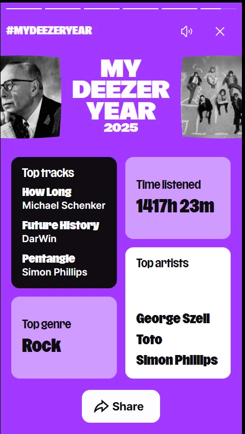 Ich hatte meine Zusammenfassung neulich schon im anderen Thread über My Deezer Year 2025 als Screenshot gepostet, weil der Share-Button nicht funktionierte. Aber hier noch mal für Hörstunden Bragging Rights: 😉