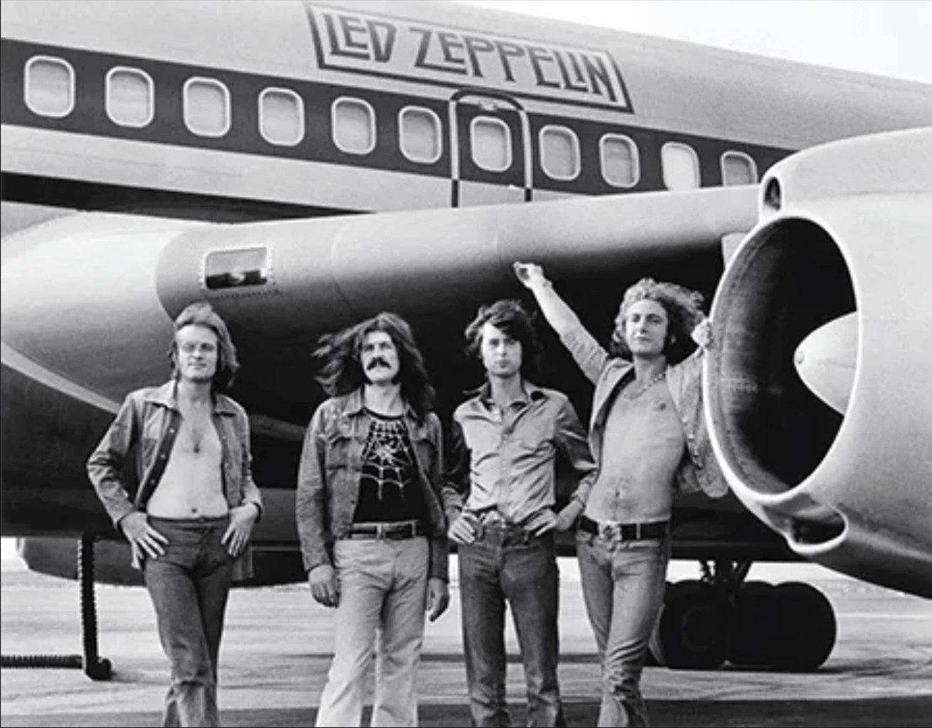 Das Bild zeigt Led Zeppelin vor ihrem privaten Boeing 720 Jet, „The Starship“ – ein Sinnbild für den Glamour, Größenwahn und die Aura des Rock’n’Roll der 70er-Jahre.