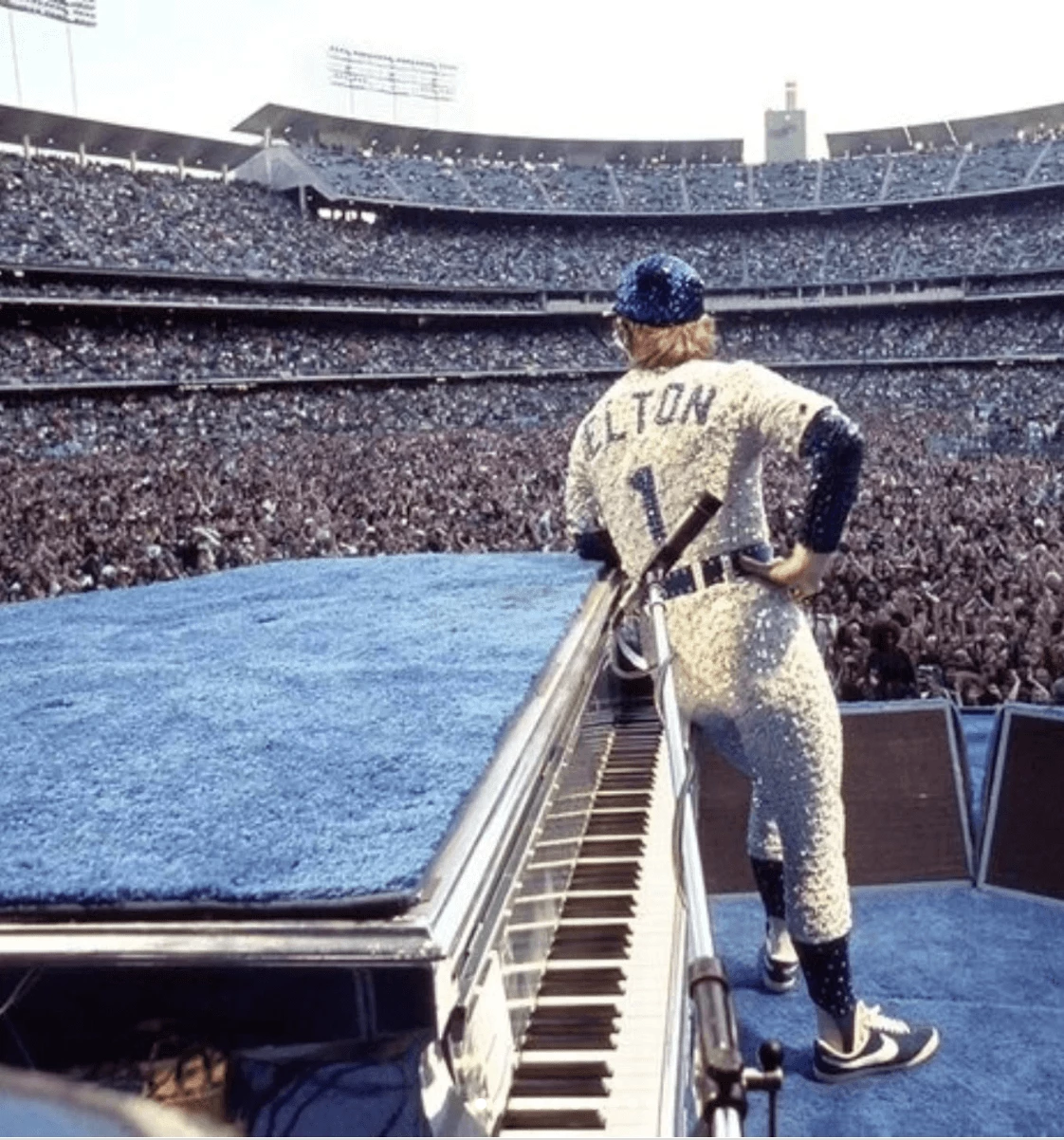Elton John am Flügel, im glitzernden Dodgers-Outfit vor 55.000 Fans – dieses Bild ist mehr als nur ein Konzertfoto. Es ist ein Symbol für Spektakel, Glamour und Stadionrock pur.