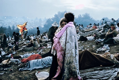 Ein junges Paar, umarmt und in eine Decke gehüllt – mitten im Schlamm von Woodstock. Dieses Foto wurde zum Symbol einer Generation und der verbindenden Kraft von Musik.