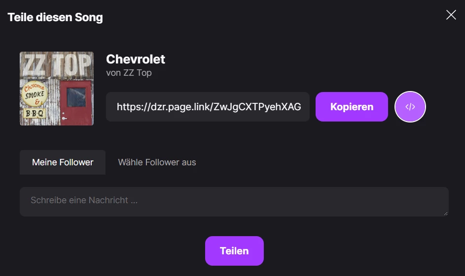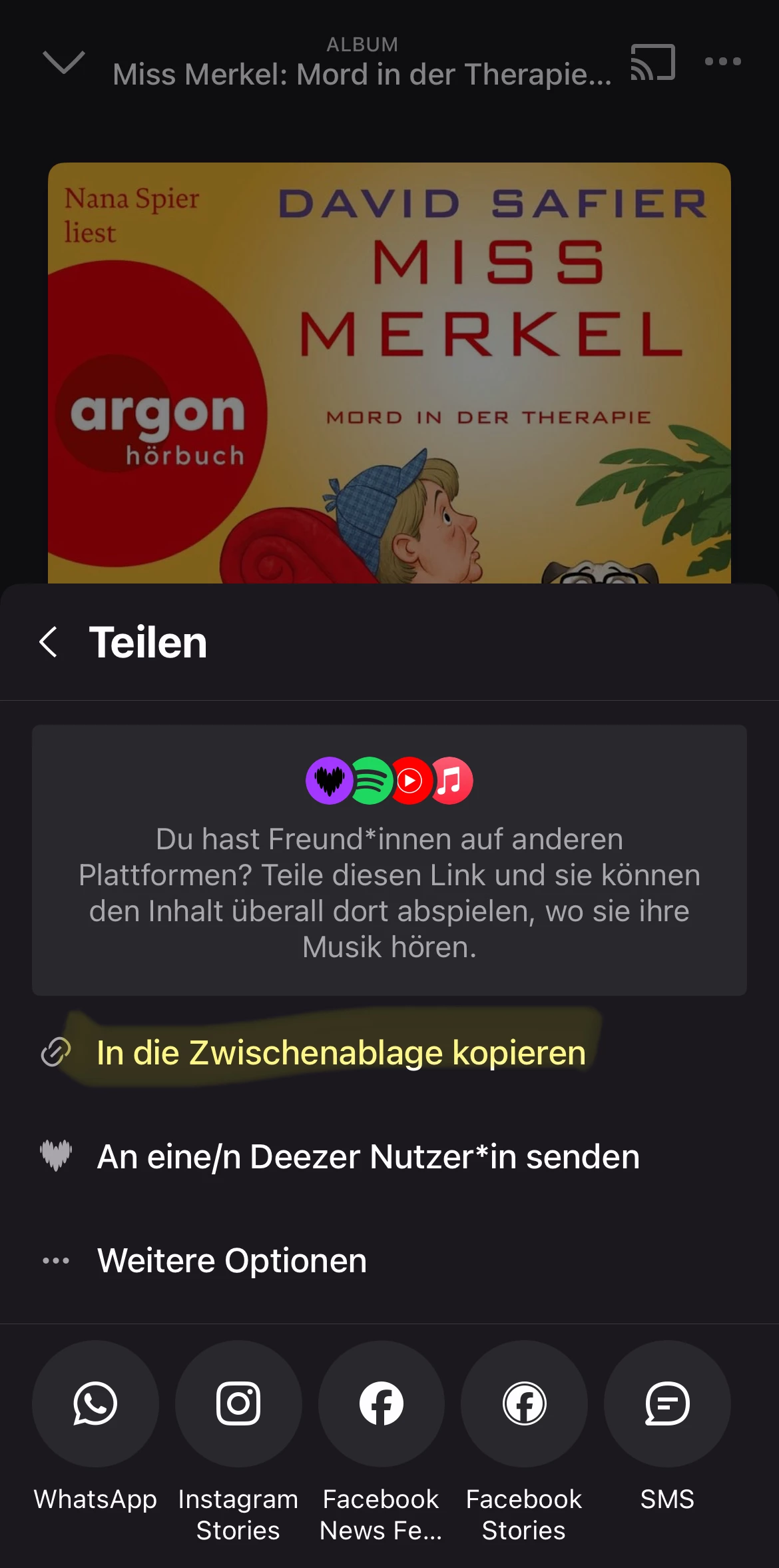 • nutze in der Deezer App für den Titel das Teilen Symbol und wähle im erscheinenden Menü „in die Zwischenablage kopieren“ aus.